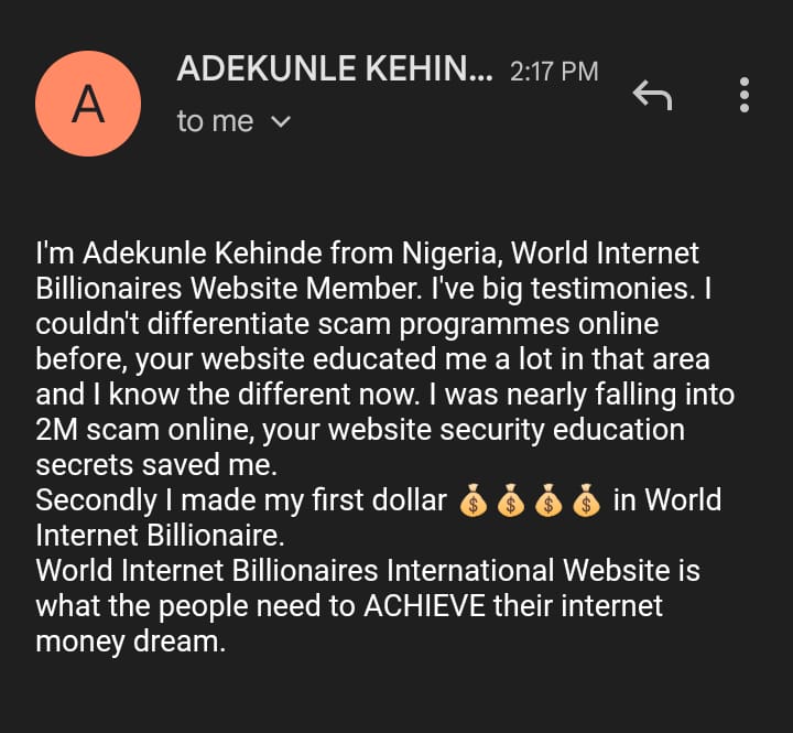 Let us hear from people like you that have learned from World Internet Billionaires International Entrepreneurship Website or its Founder directly.
